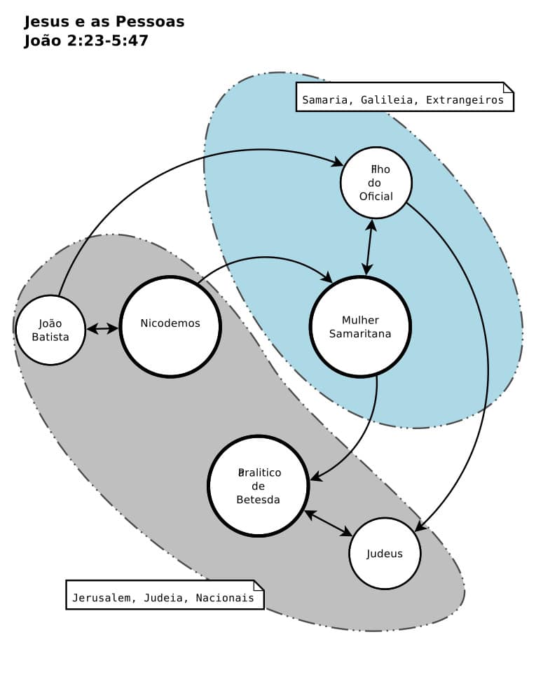 O foco aqui são as pessoas. João reduz o amplo conjunto de seres humanos a três grandes relatos mas que quando contabilizados os outros menores dá um total de seis. Os grandes são os que sempre lembramos: Nicodemos, a Mulher junto ao poço e o Paralítico. Os três relatos menores (mas não menos importantes) são o de João Batista, o filho do oficial e os judeus em geral.
